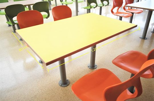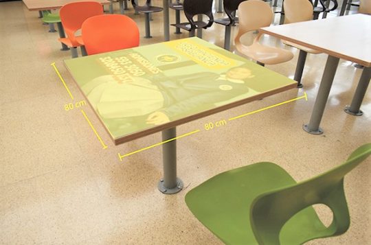 Ubicadas en la plazoleta de comidas del centro comercial. Mesa cuadrada y mesa rectangular.